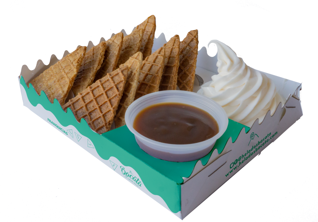 Olvida todo lo que sabes y sumérgete en esta experiencia. Crujientes y dorados triángulos de galleta waffle, listos para que los zambullas sin piedad en una piscina de nuestra adictiva salsa de arequipe (o caramelo). ¿El toque final? Un remolino perfecto de helado suave y cremoso que equilibra cada bocado con su frescura.
